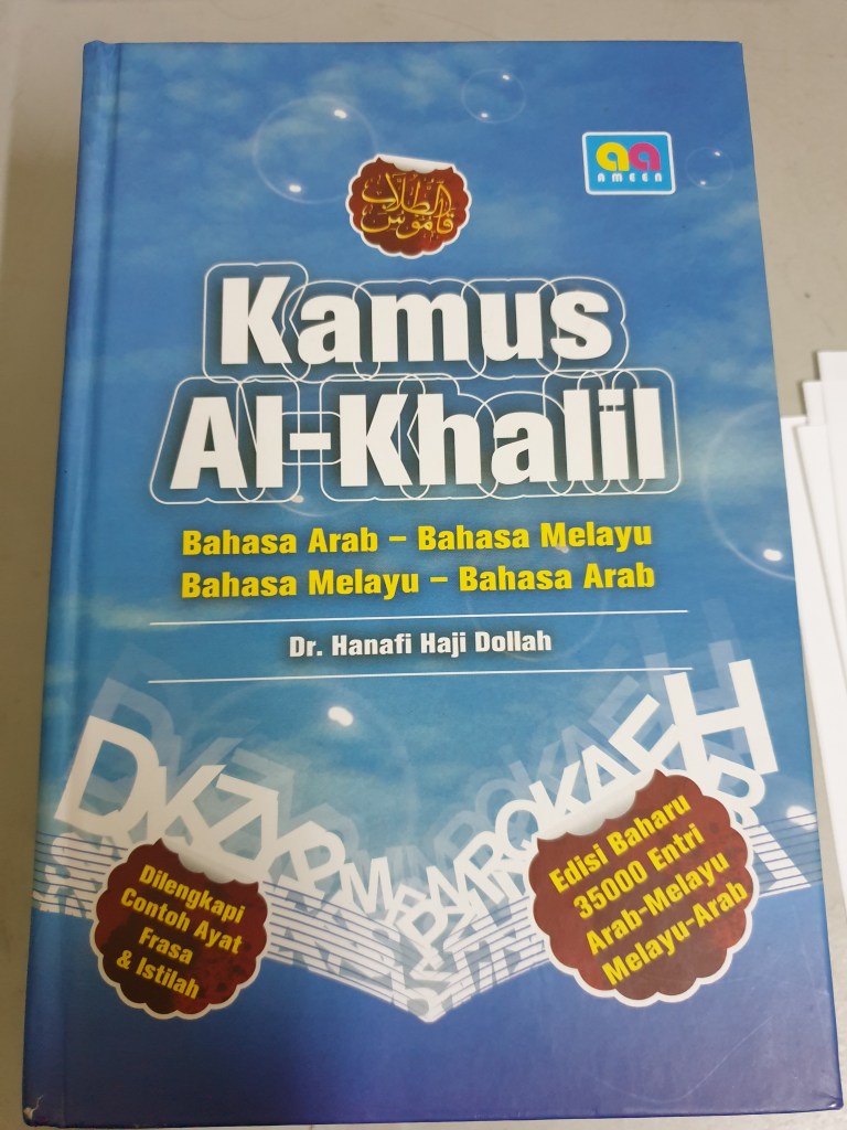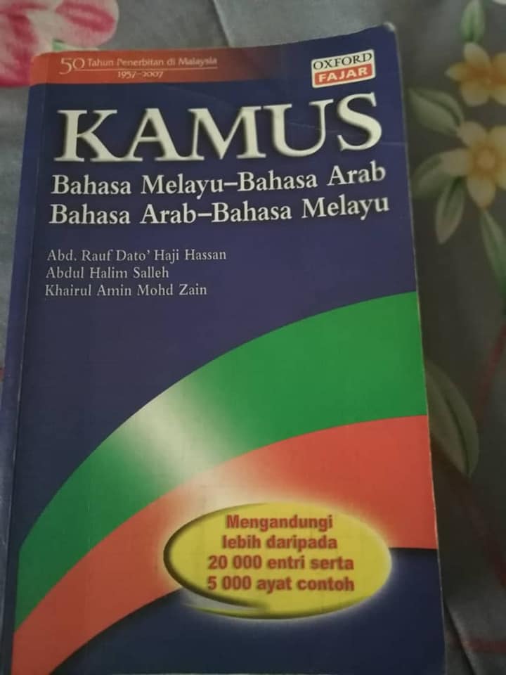 I have been a foreign language teacher to college students and adults for many years now and one of the things I take my time to teach is ‘dictionary skills’. This is because adult learners have the maturity to take control of their learning thus making it worthwhile to teach these skills. But before that, they need to get a PROPER dictionary. My advice for learners of Arabic:1. Avoid buying a dictionary containing 3 or more languages, eg. Arabic – Malay – English. This is because it is only useful for ‘concrete’ nouns/words like ‘table’ or ‘apple’. Later on, you would want to use more abstract words, like ‘life imprisonment’, and such words cannot be successfully explained in 2 other languages in the same dictionary. For beginners, you can use a children’s dictionary containing the 3 languages but later you need to buy a more advanced one. Children’s dictionaries are colourful so I understand the attraction. It motivates my students, especially ladies. 2. Avoid buying a dictionary which only lists down words and their translations (see photo 1). I call it a LIST, not a dictionary. Because it does not give the required information a learner needs like the word’s classification (اسم، فعل، حرف), a noun’s plural form (ج) and later on, additional information relating to a higher understanding of grammar (ممنوع من الصرف). In addition, at times learners need sample sentences to show how a word is used, something a mere list cannot provide.3. Do buy either an Arabic-Malay/Malay-Arabic dictionary or if your command of English is strong, buy an Arabic-Eng/Eng-Arabic one because English authors have come up with dictionaries earlier than Malay authors. Having said that, the Malay authors have improved by leaps and bounds in this area. 4. Understand that each dictionary has its advantages and disadvantages. The more you use a dictionary, the more you appreciate this.Normally a dictionary would use the traditional root-word entry. So for the word مدرسة, you would find it under the letter د not م. However, I find that modern dictionaries arrange their entries according to the spelling. Thus, مدرسة may be under م in these dictionaries. Either version is fine but perhaps you need a teacher to explain this, I think. 5. Also, different dictionaries serve different purposes. I was once a beginner, so I actively used a pocket dictionary, al-Mawrid (photo 2), a gift from my father when he visited Syria. Then, I started using Hans Wehr (photo 3), an Arabic-English dictionary because it is a very comprehensive, one-way dictionary for Arabic to English translation work. This was a gift from my student, Ustaz Ashafizrol. Now I have the Oxford Fajar Arabic-Malay/Malay-Arabic dictionary and another one called al-Khalil (photos 4 and 5), also gifts from my students. I usually recommend them to Malay-speaking learners. 6. Nowadays learners have begun to use online dictionaries. I find that men prefer the online ones. They are less cumbersome to bring to class. My favourite is al-Maany (photo 6) due to its wide coverage of sample texts in different fields. So a learner gets to learn different uses of a word in different contexts. Once you have found a dictionary, use it and if you do not know how, don’t be shy to ask your teacher to teach you. ![]()